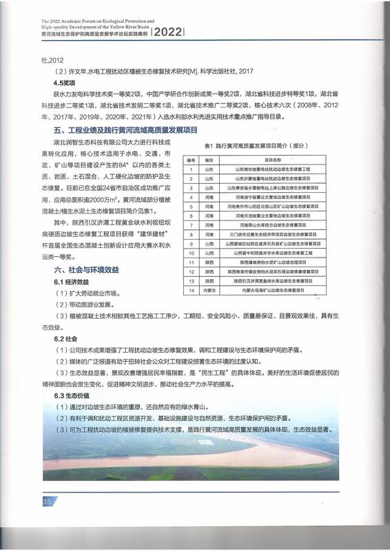 湖北潤智生態科技有限公司作為國內生態護坡領航者,其創新成果緊扣陜西省科學技術協會聯合沿黃省區科協等單位舉辦的“2022年黃河流域生態保護和高質量發展學術論壇”的主題,貫徹習近平總書記關于黃河流城生態保護和高質量發展的系列重要講話材神,落實黃河國家戰略,我公司相關創新成果CBS植被混凝土/VCS植生水泥土等生態防護技術、專利產品—潤智生態劑,及典型案例——“引漢濟渭工程黃金峽水利樞紐壩肩硬質邊坡生態工程”作為科技與經濟融合的成功案例獲得入選“2022黃河流域生態保護和高質量發展學術論壇實踐案例”中。